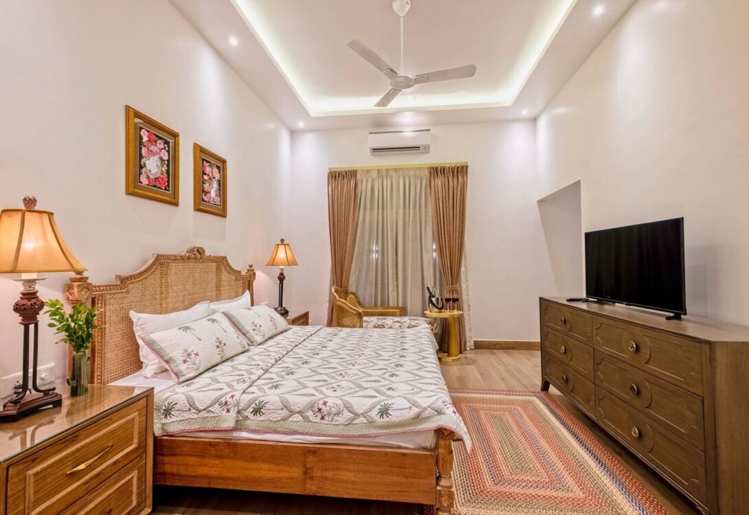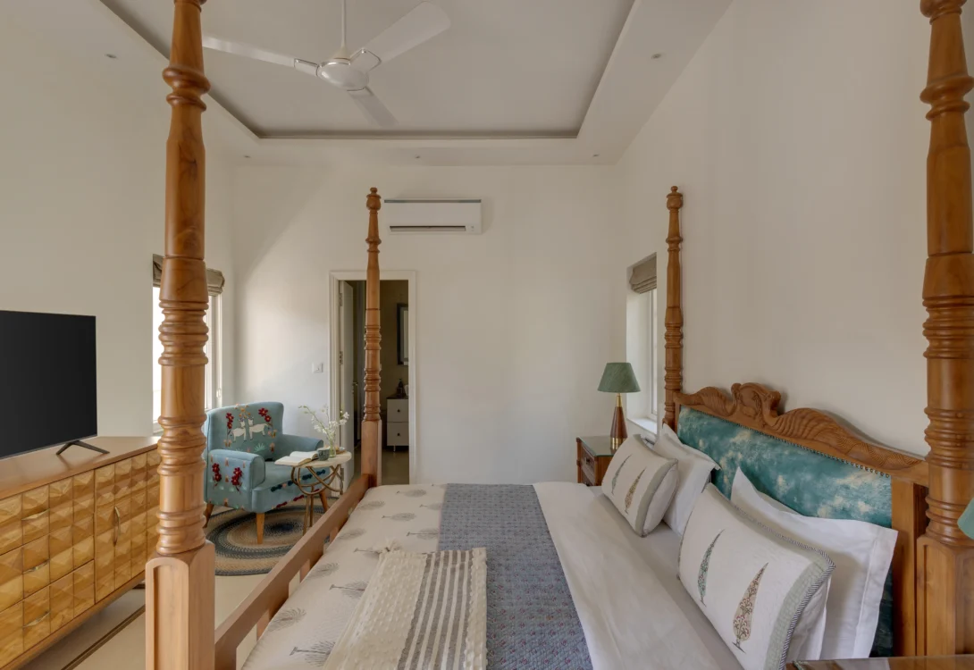 All four bedrooms have en-suite bathrooms and their own character — one with a king bed and garden view, one with balcony access, and each with enough space and quiet to feel genuinely private. The fully equipped kitchen, Bluetooth sound system, high-speed WiFi, and daily housekeeping round out a stay that doesn't ask you to compromise on anything.